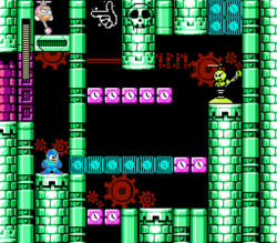 In the boss arena, there are two Bomb Thrown enemies at the top that can launch bombs at the player while Time Man is using Time Slow due to the Time Blocks above them being disabled.