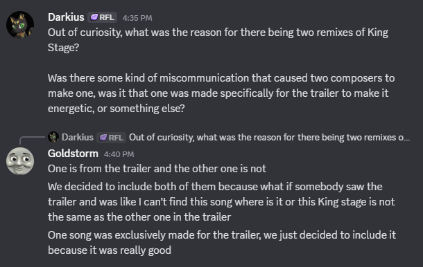 Goldstorm explains in a private Discord message with User:DarkiusMC that 40Nix's version of the King Stage music theme was initially made exclusively for the 1.8.0 trailer, but was later included in the game for its high quality and to avoid potential confusion by its omission.