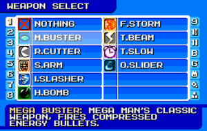 Mega Buster Shoots three bullets at a time, Mega Man's default weapon. Can be charged up if enabled. Mega Man's classic weapon, fires compressed energy bullets. 1 3 Mega Man 1